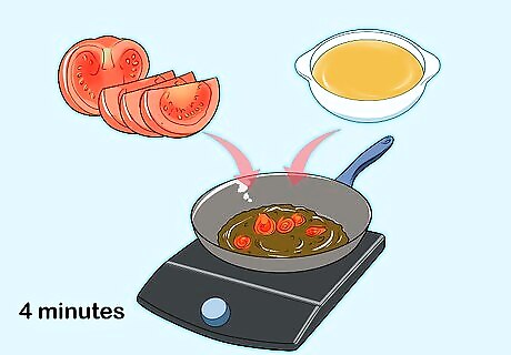Add your remaining ingredients. First, add the tomatoes and broth. Lower the heat to simmer and cook for about four minutes. Then stir in your basil and parsley.