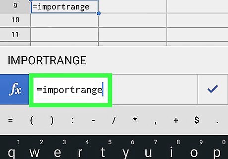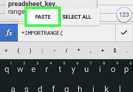 Paste the copied link between the parentheses () at the end of “IMPORTRANGE.” Here's how: Tap the gray parentheses in the “fx” box. Tap your keyboard’s backspace button. This deletes the second parenthesis. Tap and hold the empty space next to =IMPORTRANGE(. Tap PASTE. Re-add the end parenthesis at the end by tapping the ) button below the “fx” box. The URL should be surrounded by quote (“) marks, followed by a comma (,), followed by the sheet and cell range which will also be surrounded by quote (“) marks. Example: =IMPORTRANGE("https://docs.google.com/spreadsheets/d/abcd123abcd123", "sheet1!A1:C10").
