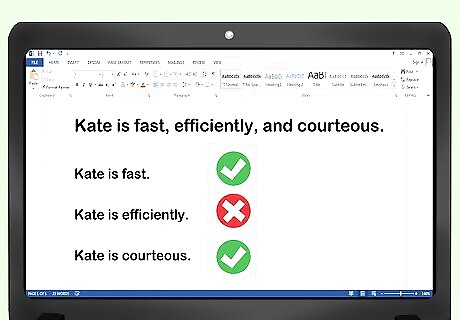 Isolate each part of the sentence if you're not sure if it's correct. When you're trying to determine whether a sentence is parallel or not, try isolating each individual element. Then, rewrite the sentence with only that section. For instance, in our previous example, “Kate is fast, efficiently, and courteous,” both the sentences “Kate is fast,” and “Kate is courteous,” make perfect sense, since they have a subject, a verb, and an adjective. However, the sentence “Kate is efficiently,” doesn’t make sense, since "efficiently" is an adverb. The simplest way to fix this sentence to change the adverb “efficiently” to the adjective “efficient.” Since “Kate is efficient,” is grammatically correct, you know that “Kate is fast, efficient, and courteous,” is a parallel sentence.