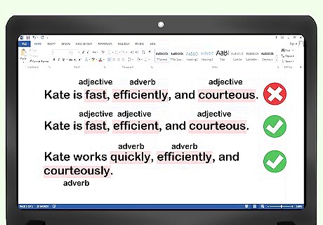 Be consistent when listing items in a series. One of the most prevalent uses of parallelism is when you're writing a list. Whether you’re detailing a list of objects or you’re writing a list of descriptive words, your sentence will be stronger if each item follows the same structure. For instance, the sentence, “Kate is fast, efficiently, and courteous,” doesn’t sound correct, because the word “efficiently” is an adverb, while the other words in the list are adjectives. To correct this, the sentence could either be written, “Kate is fast, efficient, and courteous,” which uses all adjectives, or “Kate works quickly, efficiently, and courteously,” which uses all adverbs. Another incorrect example would be, “He wanted to drive cars, go on trips, and being famous,” since the first 2 items in the series are infinitives and the third is a gerund. Instead, you would say, “He wanted to drive cars, go on trips, and be famous,” which uses all infinitives.