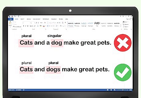 Make sure nouns have the same number. When you're using nouns to refer to general ideas, make sure you're using all singular or all plural nouns. This will make you sound more authoritative, and it help the reader understand what you're trying to say. For instance, it sounds strange to say, "Cats and a dog make great pets," since the word "cats" is plural and "a dog" is singular. Instead, you would say, "Cats and dogs make great pets," since both "cats" and "dogs" are plural. If you're referring to specific items, such as "My living room has a couch, two chairs, and a throw rug," it's fine if the noun numbers don't match.