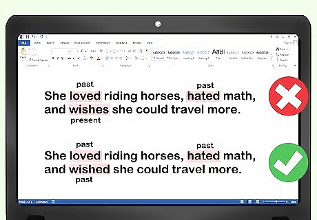 Check verbs to ensure they're in the same tense and form. In order to be parallel, the verbs in your sentence should be in the same tense. Also, avoid mixing gerunds, such as “eating,” “playing,” or “running,” with infinitives like, “to talk,” “to go,” or “to follow.” For instance, the sentence “She loved riding horses, hated math, and wishes she could travel more,” mixes past tense ("loved" and "hated") with present tense ("wishes"). Instead, you would say, “She loved riding horses, hated math, and wished she could travel more,” which are all in the past tense.