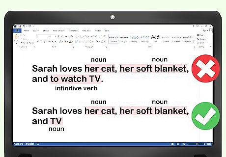 Use the same parts of speech throughout a sentence to make it parallel. If you're listing a person's best qualities, for instance, don't mix adverbs and adjectives, or nouns and verbs. Whether you're writing about an object or listing items in a series, your sentence will make more sense if you're consistent with the types of speech you use. For example, you wouldn't say, "Sarah loves her cat, her soft blanket, and to watch TV," since "cat" and "blanket" are nouns but "to watch" is an infinitive verb. However, you could say, "Sarah loves her cat, her soft blanket, and watching TV," since "watching" is a gerund, or a verb that acts as a noun. To make this sentence even more balanced, you would say, "Sarah loves her cat, her soft blanket, and TV," since these are all nouns. It is always helpful to prioritize sentence clarity when creating parallelism in a sentence.