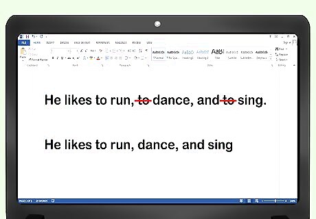 Omit repeated words in a series to make your writing more concise. When you’re listing a series of similar items, especially infinitive verbs, you may notice some repetition, particularly of the word “to.” It’s up to you whether to leave the repetition in place, but removing it can make your writing seem more streamlined. The sentence, "He likes to run, to dance, and to sing,” is correct, since the verbs are all infinitives, but “He likes to run, dance, and sing,” is more to the point.