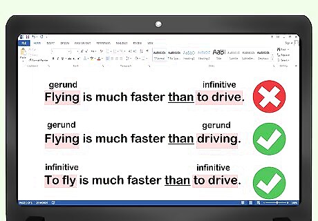 Match up parts of speech when comparing and contrasting items. When you compare objects using words like “greater than,” “less than,” “as much as,” “better,” or “worse,” the objects on either side of the comparison should follow the same grammatical structure. If you use verbs, they should be the same tense. For instance, you could say, “Flying is much faster than driving,” in which case both items or gerunds. You could also say, "To fly is much faster than to drive," so that both elements are infinitives. However, it would be incorrect to say, “Flying is much faster than to drive,” since "flying" is a gerund and "to drive" is an infinitive. The same rules apply for correlative conjunctions, including “either/or,” “neither/nor,” “both/and,” and “not only/but also.” For example, you would say, “You can choose either having a party or going on a trip,” in which cause both items are gerund phrases, rather than “You can choose either having a party or to go on a trip." In the second example, "having a party" is a gerund phrase, but "to go on a trip" is an infinitive phrase.