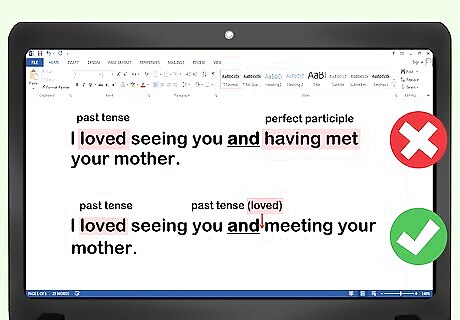 Imagine each sentence as an equation that has to be balanced. In math, the goal of an equation is to make both sides as balanced as possible. When you’re writing, imagine that your words need to be similarly balanced. For instance, the sentence, "For my birthday, I want presents and to eat cake,” is unbalanced, because “presents” is a noun, but “to eat” is a verb. The correct way to write the sentence would be to say, "For my birthday, I want presents and cake," since "presents" and "cake" are both nouns. However, you could also say, "For my birthday, I want to open presents and to eat cake," since "to open" and "to eat" are infinitive verbs.