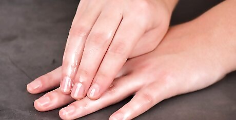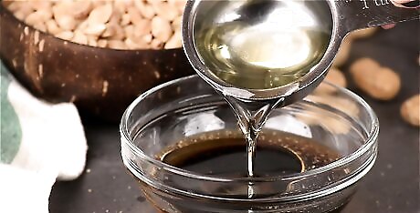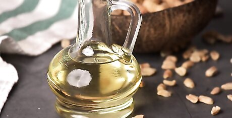 Moisturize your skin. Like most oils, peanut oil can be used to moisturize dry skin and sooth itchy, flaking skin. Pour a teaspoon (5 ml) of peanut oil into the palm of your hand and massage the oil into dry areas of skin. Peanut oil can also be used to moisturize a dry scalp. Massage the oil into your scalp for about 10 minutes. Rinse your scalp with warm water and dry your hair. Avoid using peanut oil on your face. The high fat content could cause pimples.