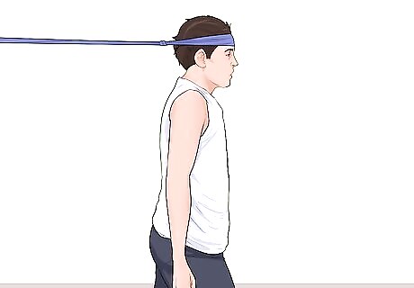 Try other strengthening exercises using equipment. You can strengthen your neck using exercise bands, which are usually color coded to represent different levels of tension. You may also consider newer technology, such as a multi-cervical unit. Try to focus on gradually strengthening the muscles in the front of your neck, your upper back, and your core, since all of these help support your neck and shoulders. Tie the least resistive elastic band around your head and attach it to something stable that's at the level of your head. Walk a few steps away from it until you feel tension in the exercise band. Then do the four main neck movements (flexion, extension, right / left lateral flexion) under tension ten times each on a daily basis. After a week or so, change to a thicker exercise band with more tension. Advance to treatment with a multi-cervical unit. This fairly-new type of machine allows a whiplash patient to sit in a machine and attach their head to a small set of weights. Starting with light weights, you can move your neck as instructed by the physiotherapist in order to strengthen the various muscles in your neck.