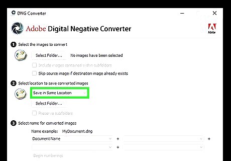 Select a location to save converted files. When you launch DNG Converter, the saved converted files location is the same as the source files. You can click "Save in Same Location" to change the folder if you'd like.