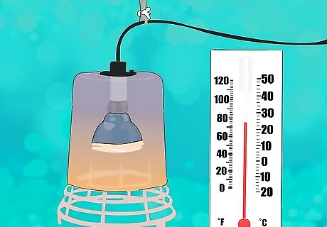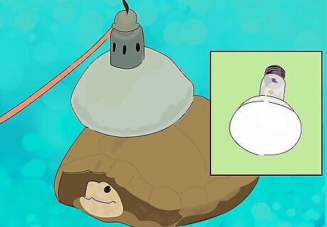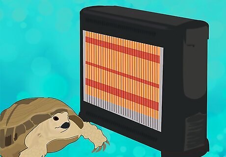Provide a heat lamp. While the hibernaculum is warming up, you need to prepare your tortoise an area to recover from hibernation. This area needs a heat lamp or a tortoise table in order for it to maintain the right temperature. The constant temperature in the tortoise enclosure needs to be at least 86 degrees Fahrenheit (30 degrees Celsius). The heat lamp should be around 150 Watts and mounted about 40 cm (15 to 16 inches) above where you lay your tortoise, which is perfect distance for him to bask in the heat. Do not rely on the natural heating in your house because it will not be hot enough for your tortoise. which has a heat lamp.