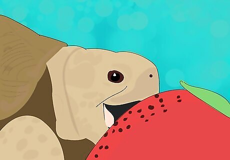 Offer him food. After you get your tortoise to drink water, he will also need to eat. Give him fresh fruits and vegetables that will entice him to eat. Tomatoes and strawberries are especially good when he is first waking up because tortoises find these foods extremely tasty, which will encourage him to eat them. The amount of food he eats will vary depending on what stage of the waking up period he is in, so just put in what you would normally feed him per day and gauge how much he eats. Since he will be under a heat lamp, you will need to put small portions out a few times a day. Leaving the fruit and veggies too long will cause them to dry out and your tortoise won't eat them.
