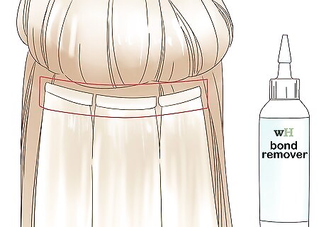 Remove your extensions with bond remover. Tape in extensions can be easily removed without any harsh chemicals by using an organic bond remover. Always start from the nape of the neck and section out the lowest row of hair extensions. After applying bond remover, wait a couple of minutes for it to seep into the extension bond before peeling it off slowly. Be careful that you are not pulling your hair to avoid hair loss. If it gets stuck, simply add more and repeat the process. If you are not comfortable removing your own extensions, go to your regular salon and they will be able to remove it for you.