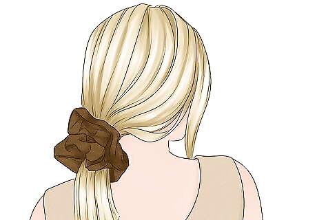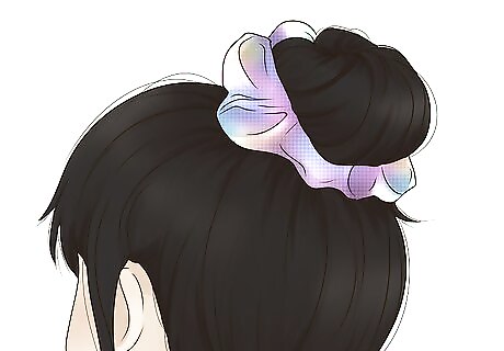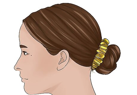This high-fashion look is sure to turn heads. Brush your hair back into a low bun and secure it with bobby pins. Wrap a scrunchie around the bun for a fun pop of color. If you have curly hair, don’t worry about brushing it! Instead, add a thin layer of hairspray or gel to keep your flyaways in place. This is the perfect style to wear with a more designer outfit, like an oversized pantsuit or a flashy dress. Try using a large scrunchie with lots of material for a show-stopping accessory.