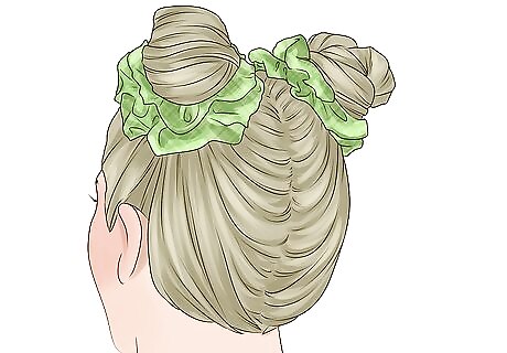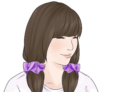 Complete a nostalgic outfit with this hairstyle. Split your hair down the middle and pull a scrunchie over each pigtail. This is a fun way to complement a whimsical outfit like overalls or a jumpsuit. You can match both of your scrunchies for a more cohesive look, or you can try mixing and matching colors or patterns!