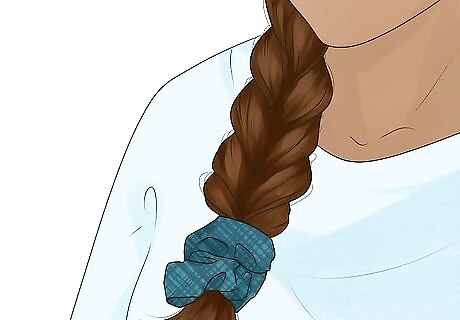 This simple style goes well with almost any outfit. Brush your hair out and split it into 3 even sections. Do a classic braid by crossing over the right side, then the left side, then the right side again, alternating all the way down. Secure your braid with a scrunchie to keep it in place. You can pull your hair to the side to show off your braid, or you can leave it trailing down your back to get it out of the way. This style works best with a smaller, thinner scrunchie so it actually stays in place at the end of your hair.