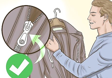 Look for metal hardware detail. From a bomber to a military jacket, shiny metal hardware adds refinement and quality to suede. Opt for snaps instead of buttons, especially on a bomber jacket and check the zippers on biker and moto jackets. Make sure zippers are metal and not flimsy or colored plastic.