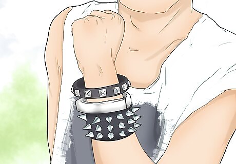 Layer metal cuffs and studded bracelets for an edgy style. Stick with silvers and dark metals, anchoring your style with a wide, studded cuff. Don’t be afraid to go for spikes and tougher styles, and try materials like leather as well. Pair your statement bracelets with a pair of torn jeans and a band T-shirt, or a grungy dress and boots.