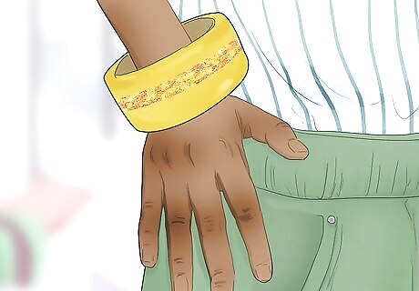 Stack textured and woven bracelets to create a bohemian vibe. Look for bracelets with bright, geometrical beads, unusual designs, hammered metal, and atypical materials, like wood. Stack these different bracelets and pair them with a flowy, draped dress or a patterned shirt with frayed jean shorts or bell bottoms.