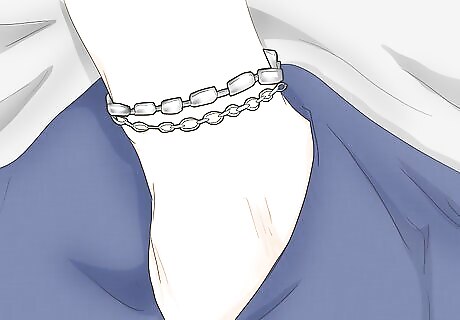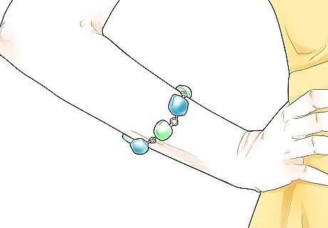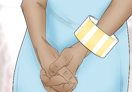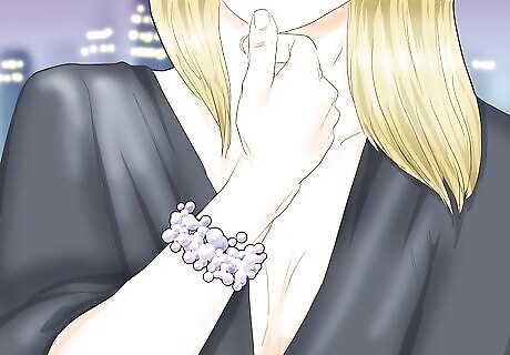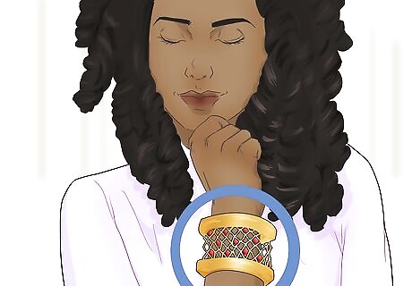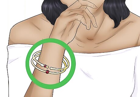 Try a bold statement bracelet for a special event. When you’re heading to a nice event, like a wedding or fancy company dinner, try something out of the ordinary. Go with a thick cuff with a large gemstone, or a string of pearls twisted around your wrist and fingers. Evening fabrics, such as velvet, satin, and silk, also pair beautifully with filigree styles and burnished metals.