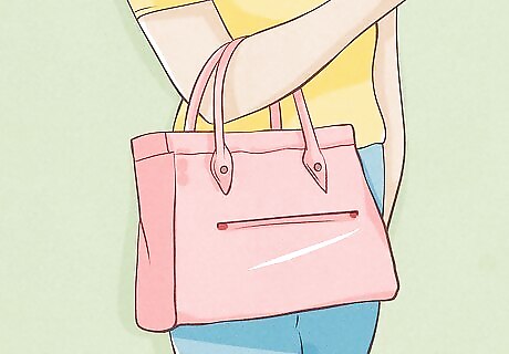 Carry a pink handbag. If you're wearing a neutral outfit (e.g. a white dress or plain denim jeans with a white/khaki top) carrying a pink bag with you can add a bit of flair. Try to keep the bag in line with the style you are trying to present. For example, if you are going for an elegant look, opt for a more neutral or pale shade of pink. If you want to go for an edgy look, find a bag that is in a bold, bright pink.