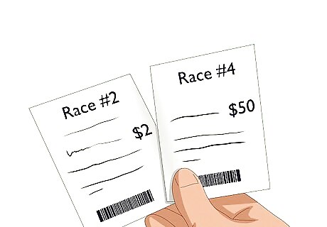 Bet with friends. There's such a thing as a "parlay bet" and it can make betting on the horses even more fun. If you're with a group, get everyone to chip in, say, $5. Then, each person picks 1 horse to show on a certain race. Place the first bet, and then if you win, place the next bet including the winnings. If you hit a streak, that $5 can add up very quickly. Make sure the winnings (and the losses) get split evenly. Have everyone agree to a basic set of guidelines before participating in any betting. Some people may argue that they won while others lost – establish protocol before this happens.