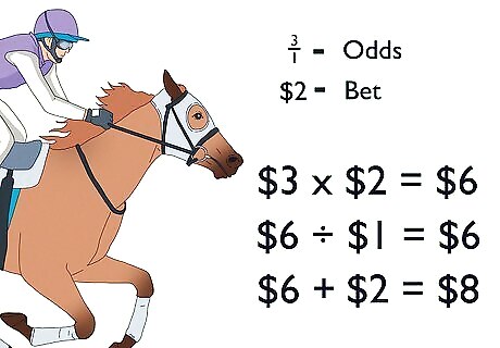 Know your odds and payouts. Let's say you bet $2 on a horse to win (which is the standard minimum bet). To determine how much you would win if she wins, take the odds of your horse and multiply the first number by 2 (your bet), then divide that by the second number, and then add $2 (again, your bet). Let's say your horse has 3/1 odds. You multiple 3x2 to get $6. Divide that by 1, which is still $6. Then you add $2. You would make $8 on a $2 wager. Let's take a bet where lots of people are betting, like on a horse with 1/9 odds. You multiply 1x2 to get $2. Then 2/9, which is about 20 cents. Plus $2, and your winnings is $2.20.