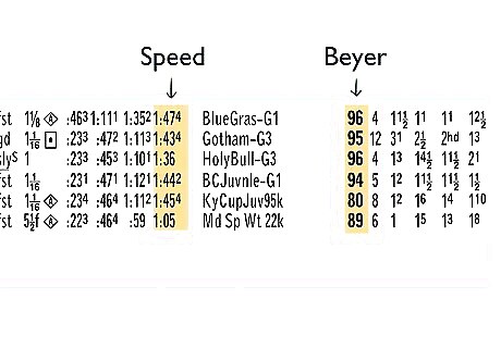 Look at the Beyer Speed Figures. Beyer numbers often serve as a starting point in the handicapping process. They are the bold numbers found in the middle of each DRF, indicating the horse's past performances. Handicappers often use the horse with the highest last-race Beyer as their focus and eliminate horses that have never run a figure close to this horse's figure. There are two numbers: pace and speed. Pace projections. By scanning the past performances, handicappers try to estimate the pace of the current race and determine which horse will benefit most from it. The first bold-face number, pace, shows whether the horse likes to be on the early lead or not. Speed projections. This is not the same as pace. Speed (the 2nd bold-faced number) shows the horse’s ability to pass other less-speedy horses as they near the finish line. Speed does not equal consistency (which pace can).