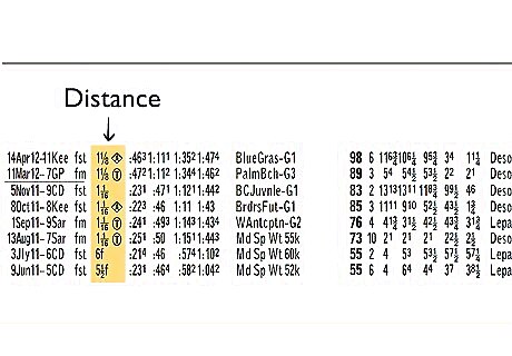 Look at that race’s distance. Distance is one of the biggest factors when it comes to betting. If you’re looking at a horse that tires out around six furlongs and you’re at the Belmont Stakes where it’s a whopping twelve furlongs, you probably don’t want to bet that horse. How has your horse run in other races of this similar length? Distance, pace, and speed are very powerful in tandem. Looking at how your horse runs (and, as importantly, how she finishes) in different distances will clue you in to how she’ll perform in races of different lengths.
