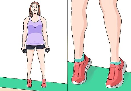 Perform calf raises to exercise your lower legs. Start with your knees slightly bent and your arms out in front of you. Keep your feet flat on the ground and your back straight. Lift your heels and balance on your toes, and hold the calf raise for 1 or 2 counts before putting your feet back down. Perform 3 sets of 15 calf raises. Calf raises can also be done on the edge of a slightly elevated surface, such as a stair, to get a full range of calf motion. Calf raises help perfect your balance.