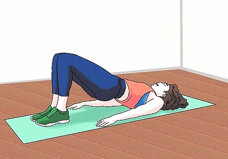 Strengthen your hips with bridges. Lie on your back with your hands at your side. Bend your knees so your feet are underneath them and flat against the ground. Tighten your glutes and thighs to raise your hips off the ground until they form a straight line with your torso. Slowly lower your hips back onto the floor. Do 3 sets of 15-20 reps. Your hip muscles help you while you toe slide and toe turn while you’re snowboarding.