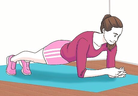 Hold your body in a plank position to strengthen your abs. Start on the floor on your hands and knees. Extend your legs and hold your body off the floor with your toes. Put your forearms on the ground so your elbows are at a 90-degree angle and directly below your shoulders. Keep your back straight to form a line with your body. Try to hold the position for 2 minutes. When you feel comfortable holding a plank position, try lifting one of your arms or legs into the air to activate your core even more.