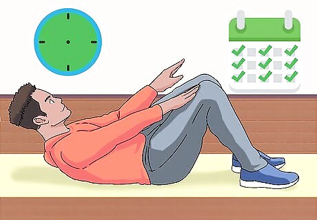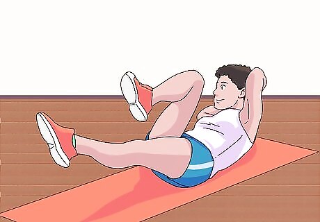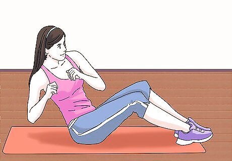 Try Russian twists to work on your obliques. Lie on the ground so your back is straight, knees are bent at a 45-degree angle, and your feet are flat on the floor. Lift your upper body so it makes a V-shape with your thighs. Twist your torso to one side until you feel your muscles contract. Hold the pose for 1 count before twisting to the other side. Do 3 sets of 10 reps on each side. For a more difficult Russian twist, hold a weight plate in front of your chest while you perform the exercise.