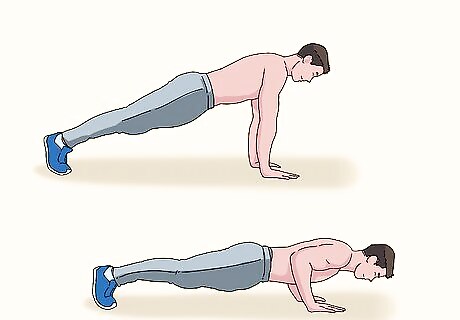 Do push-ups to work out your chest. Get on your hands and knees on the floor. Straighten your legs until you’re supporting your weight on your hands and toes. Keep your hands directly below your shoulders and your arms straight. Lower your body until your elbows are at a 90-degree angle. Hold the position for 1 count before pushing yourself up to the starting position. Push-ups prepare you for picking yourself up out of the snow when you’re on a snowboard. Start by doing 3 sets of 10 push-ups and increase the rep count when you feel comfortable. Keep your knees on the ground if you want to make the push-ups easier. To make the push-ups more difficult, elevate your feet on an exercise ball.