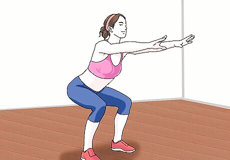 Do squats to work your quads and glutes. Stand with your legs shoulder-width apart. Bend your knees until your legs form a 90-degree angle. As you lower your body, keep your back and neck straight and extend your arms forward so they’re parallel to the ground. Straighten your legs back into the starting position. Do 2 or 3 sets of 15-20 reps. You’ll be squatting most of the time you spend on a snowboard, especially during heel turns and slides. To make your squats more difficult, hold a kettlebell or medicine ball in your hands. This will help work your arm muscles as well as your legs.