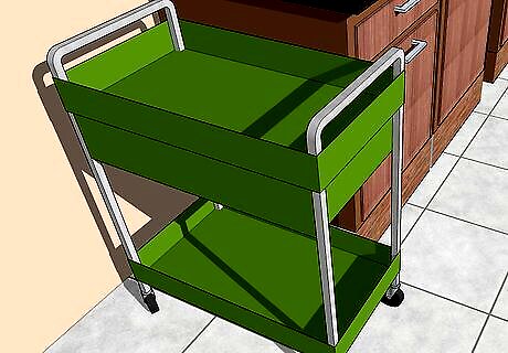 Purchase a rolling cart. A rolling cart will give you additional storage space for kitchenware. Typically these carts will come with shelves and can act like a mobile storage space. You can purchase a rolling cart at furniture and department stores.