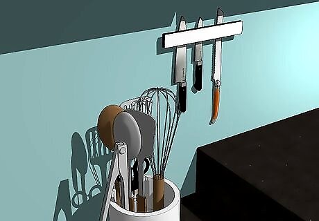 Get a magnetic knife holder. A magnetic knife holder can be mounted on the wall and will free up space in your drawers because you won't have to store knives in them anymore. You can purchase magnetic knife holders online or at kitchen stores.