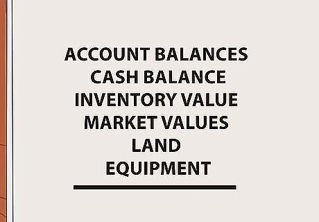 Assemble your financial information. You will need records of your assets as well as your debt. Make sure you have your latest bank statements, the balance on any loans that you owe, and the current market value of your investments. You will also need to approximate the resale value of any valuable assets that you own, including your home, cars, and any valuable jewelry or household items. In general, list any valuable items that you own for which you could find a buyer and what that buyer might pay for the item. This can be determined by researching recent sales of similar items and noting the sale price. This is called the market value. In some cases, you may need to get a certified appraisal of larger, more valuable assets.