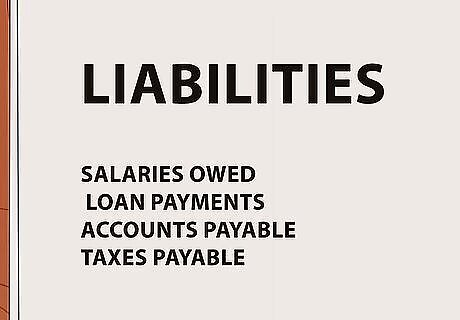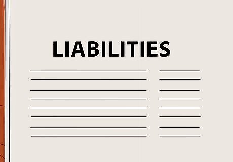 List your liabilities. In the second column or row, list your liabilities as well as their value. These refer to any debts that you owe. Specifically, liabilities can include: Student loans Auto loans (what you currently owe) Credit card debt (this includes debt currently incurred even if you plan to pay it off at the end of your statement month) Mortgage balance The balance of any other personal loans Outstanding bill balances (unpaid bills from this month) Taxes due or estimated taxes due next year (for this tax year)