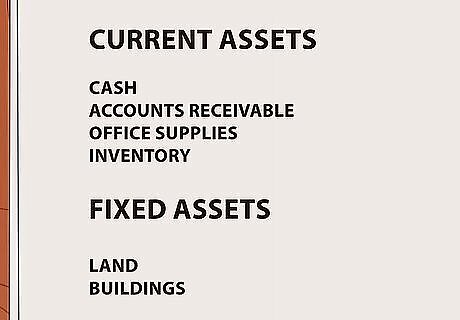 Record your assets. Assets are your company’s resources. These include cash, accounts receivable, inventory, land, buildings, equipment, and more. These will be recorded at the top of your straight line balance sheet or on the left side of a columned one. A classified balance sheet breaks down assets into the following categories: Current assets. This includes cash (any money in bank accounts), accounts receivable (money owed to you), office supplies, inventory (even incomplete items), securities (stocks and bonds), prepaid expenses (like prepaid rent or utilities), and anything expected to be received or used up within a year. Fixed assets. These assets, also called long-term assets, are the revenue-producing items owned by the company, including land, buildings, machinery, vehicles, furniture, and any other objects that are expected to last longer than a year. You should subtract depreciation from these assets so you have an accurate picture of their worth. This reduces overvaluation of assets. For more information, see how to calculate depreciation on fixed assets.