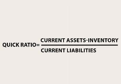 Analyze your balance sheet. One you have a completed balance sheet, you can analyze it to determine certain important metrics that measure the financial health of your business. Specifically, there are four simple ratios that can be calculated from this information: The current ratio is an approximation of a business's ability to pay its current debts. Find the current ratio by dividing current assets by current liabilities. Values over 1 are considered stronger and those under 1 are considered weak. The quick ratio, or "acid test," determines a company's ability to pay its current liabilities with its most liquid assets. This is found by subtracting a company's inventory from the sum of its cash and cash equivalents and dividing that total by it's total current liabilities. Generally, results between 0.5 and 1 are considered healthy. The debt-worth ratio analyzes a company's dependency on debt. This measure is calculated by dividing owner's equity by total liabilities. In theory, no one result is better or worse here, but a business with a higher debt-worth ratio may be considered over-reliant on debt financing. The fixed-worth ratio determines how much the company has invested its own money in tangible assets. This is calculated by dividing total fixed assets by owner's equity. A low ratio means a smaller investment in fixed assets and thus, less risk in case of business failure and liquidation.