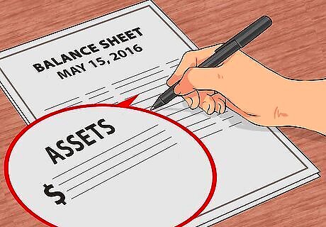 List your assets. In the first column or row, list your asset categories and their values. These include both financial assets as well as "hard" assets like cars and valuables. Listing these assets may require other tables in which you can sum the individual assets in each category. For example, if you have more than one car, you would combine the market value of your cars and list this on the balance sheet simply as "cars." The sum of these assets is your total assets. Include the following assets when making your balance sheet: Cash and account values in the bank (including checking, savings, money market, and certificate of deposit accounts) Investments (including stocks, real estate, mutual funds, college savings accounts) Any money owed to you (like a personal loan to a friend) Resale value of your home(s) Resale value of your vehicle(s) Resale value of personal property (such as jewelry and furniture)