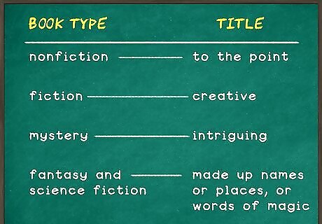 Know what kind of book you’re writing. Your title will vary depending on what kind of book you are writing. Nonfiction titles can be creative, but should be more descriptive of what the book is about. Fiction titles can be more mysterious or creative. The title is the first thing your readers will read. The title needs to give readers some idea of what’s inside the book, entice, and be informative. If you have a nonfiction book like a series of essays, or a biography, your title should be more to the point. Fiction or genre stories like horror, fantasy, science fiction, and mystery, should be creative and entice readers to want to know more, offering intrigue. Use words that are commonly associated with certain genres to start. A mystery novel could use a title like “The Mysterious Road Forks”. Readers will identify this title with mystery, unanswered questions, and a plot involving a strange road. Fantasy and science fiction titles can include made up names or places, or words of magic. “The Signal from Vandor” could be a title to a science-fiction book that tells of a strange alien signal from a far away planet named “Vandor”.