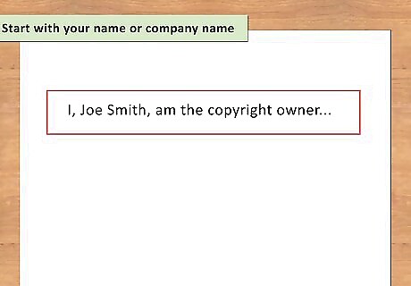 Start with your name or company name. When writing your copyright release, you need to start by identifying the person or company that owns the copyright. Since you (or the company you represent) own the copyright, it's important to state who you are at the beginning. You can start it out with something such as "I, Joe Smith, am the copyright owner..." It's also important to include your contact information. You can include it at the top like a business letter, where you put your name at the top and then your contact information under it. You can also create a standard release form, which has a place for you to write your name and contact information.
