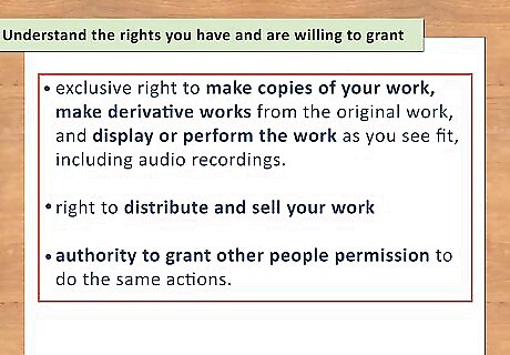 Understand the rights you have and are willing to grant. As the copyright holder, you decide what happens with your copyrighted materials. Generally, when someone ask you for permission to use your work, they will want the rights to do something specific, such as republish your photo in a magazine or use your song in a movie. You'll make the decision about whether to grant all or some of the person's request. First, though, you need to understand what rights you have. Under the copyright law, you have the exclusive right to make copies of your work, make derivative works from the original work, and display or perform the work as you see fit, including audio recordings. You also have the right to distribute and sell your work. As the copyright owner, you also have the authority to grant other people permission to do the same actions. In other words, you can give any other person the same rights you have or a limited portion of those rights.