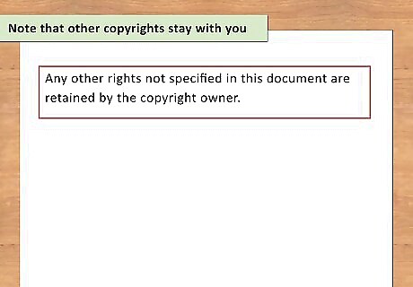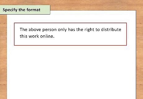 Specify the format. If you want the person to only have rights on a specific format, you can specify that, as well. For example, you could grant only web rights or only print rights. You could also specify that your work can only be used in public performances. You could write, "The above person only has the right to distribute this work online."