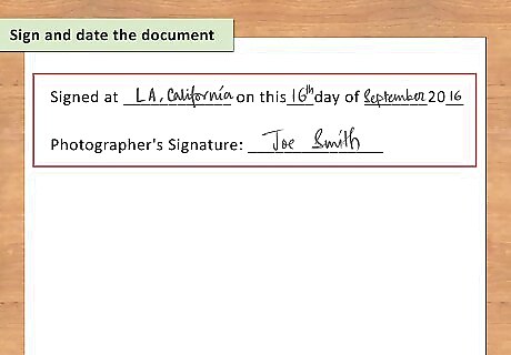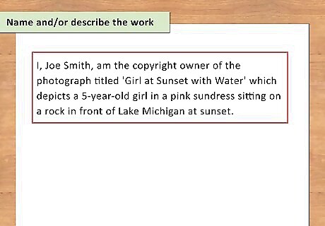 Name and/or describe the work. Next, you need to use the title of or thoroughly describe the work you are granting permission to use. That way, you are legally identifying which works the person has a right to make use of. For example, you could just use the title of a photo, or you could use the title and describe it, such as "I, Joe Smith, am the copyright owner of the photograph titled 'Girl at Sunset with Water' which depicts a 5-year-old girl in a pink sundress sitting on a rock in front of Lake Michigan at sunset." You can also just use the title or the description, such as "I, Joe Smith, am the copyright owner of the song 'Bad Mug.'" If you're creating a standard form, you can write something such as "The above person is the copyright owner for the following work:" Then you can write in a description or name of the work.