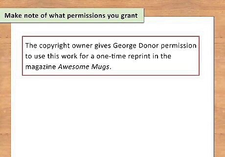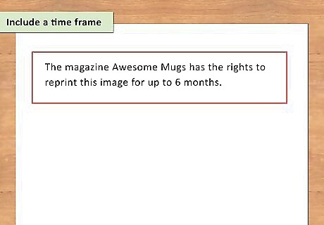 Include a time frame. You can grant rights for the life of the copyright, if you prefer. However, you can also limit how long the other person or company has the rights. For example, you can limit the permissions you grant for 6 months or a year. You could write, "The magazine Awesome Mugs has the rights to reprint this image for up to 6 months."