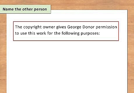 Name the other person. You also need to name the person or company you are granting permission to use your work. That way, you are giving the person written, legal permission, which you can both refer back to later. You could write something such as "The copyright owner gives George Donor permission to use this work for the following purposes:" For a standard form, leave a blank for the person or company that you can fill in with the name.