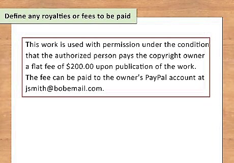 Define any royalties or fees to be paid. If you expect royalties or a flat fee to be paid, include that in your release. You'll need to specify when your fee will need to be paid and how much, as well as how the person can pay you. Royalties are generally a percentage of the profit made on the work, to be paid at a later date. For example, you could write, "This work is used with permission under the condition that the authorized person pays the copyright owner a flat fee of $200.00 upon publication of the work. The fee can be paid to the owner's PayPal account at [email protected]."
