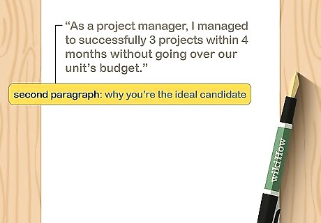 Focus on why you’re the ideal candidate in the second paragraph. This paragraph should hone in on the key reason or reason why you’re the exact match for the type of person they’re looking to hire. Include specific examples in this paragraph of the (positive) results and outcomes you’ve achieved in similar jobs or positions in the past. An example of describing a positive achievement in a previous job would be: “As a project manager, I managed to successfully 3 projects within 4 months without going over our unit’s budget.” Be sure you match your skills and experiences to the specific qualifications listed in the job description. Give the reader a concrete sense of how your past experiences can come to bear in specific ways in this job.